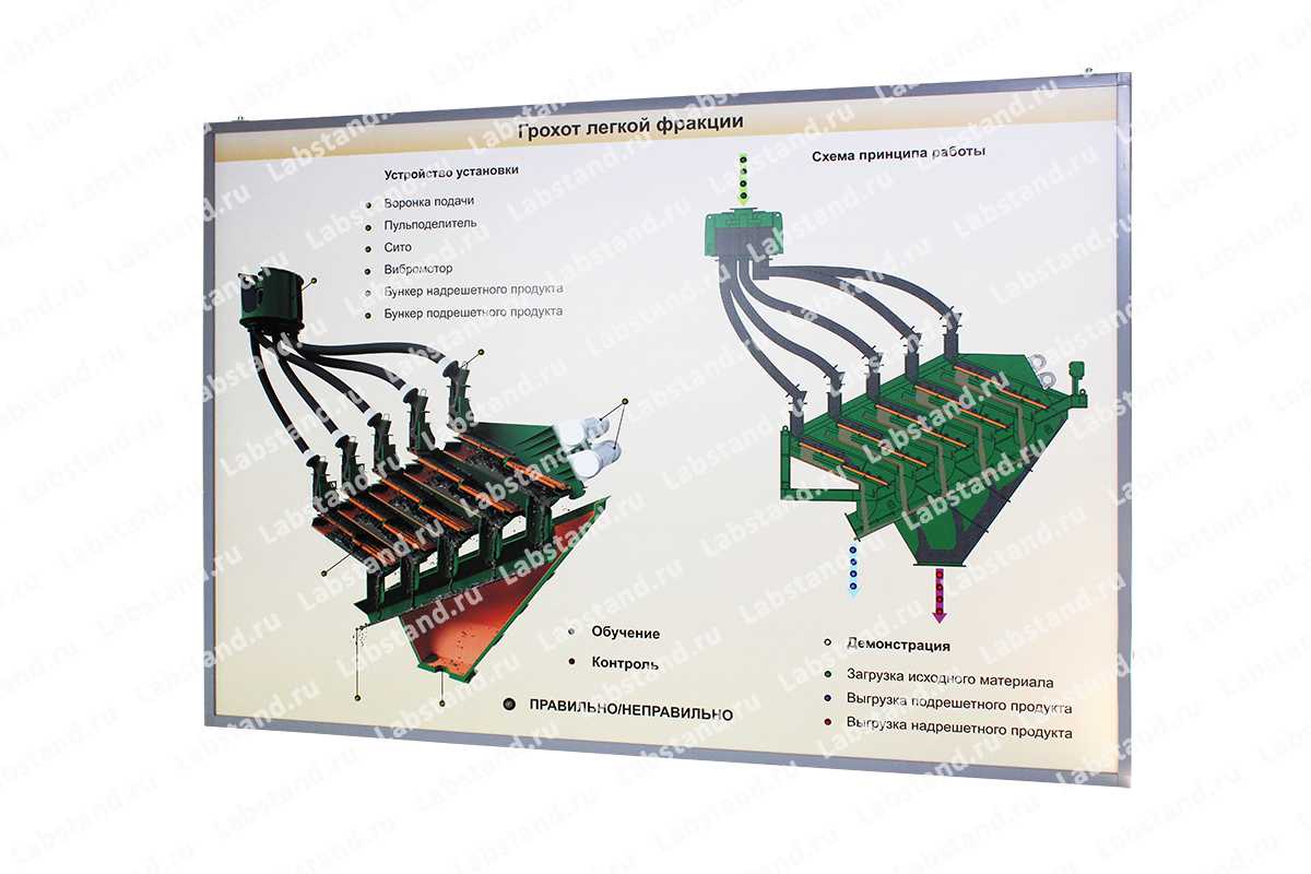 Состав: Стенд-планшет «Грохот легкой фракции», магнитная указка, блок питания, паспорт.