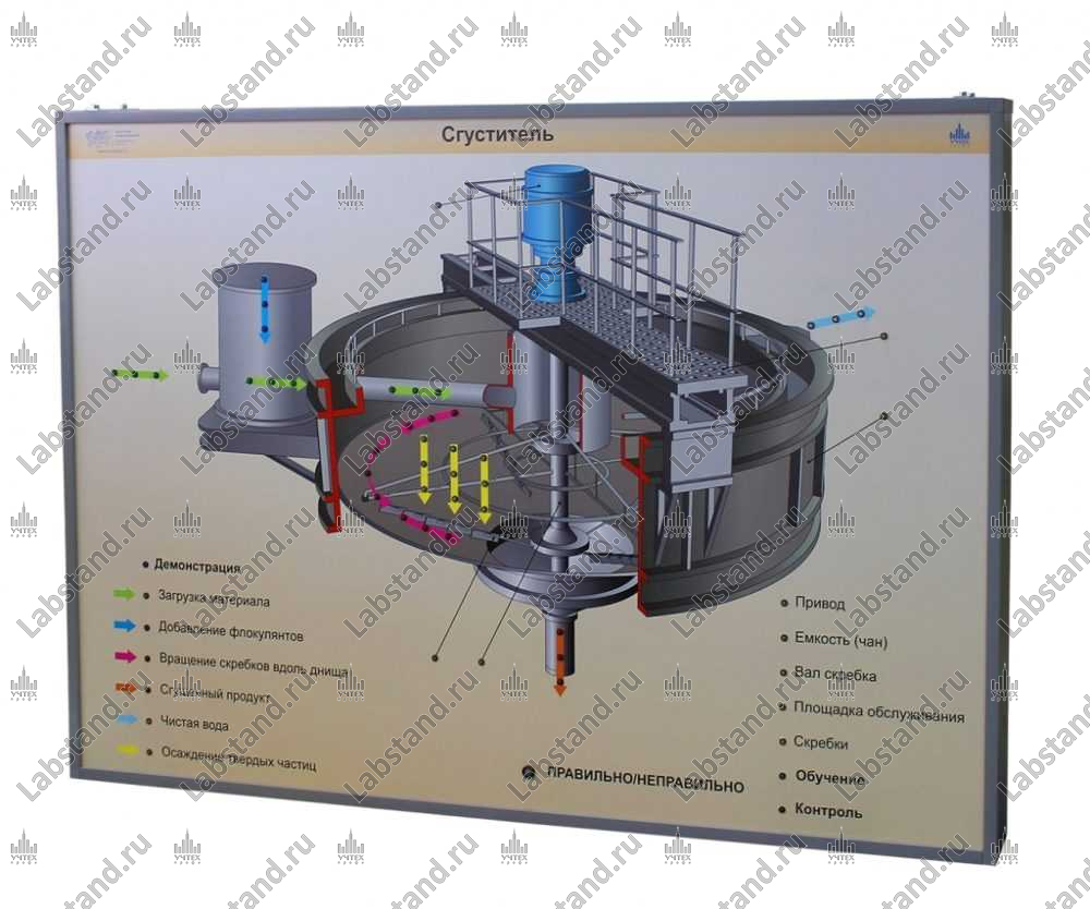 Описание. Стенд-планшет представляет собой жёсткую лицевую панель из МДФ толщиной 8 мм, в пластиковом каркасе толщиной, менее 100 мм, но более 85 мм. На лицевую панель наклеена полимерная подложка с цветным изображением сгустителя, отражающим его принцип работы и устройство. Внутри каркаса расположен контроллер управления логикой стенда. С целью наглядной иллюстрации принципа работы и устройства установки на лицевой панели установлены динамическая светодиодная подсветка и магнитные сенсоры для реализации режимов «демонстрация», «обучение» и «контроль». В режиме «демонстрация» осуществляется светодинамическая демонстрация принципа работы установки. В режиме «обучение» при выделении одного из элементов установки загорается светодиод напротив соответствующего наименования элемента. В режиме «контроль» учащийся должен сам сопоставить наименование элемента с его изображением на изображении. В комплект поставки входят: магнитная указка, блок питания с рабочим напряжением 220 В.