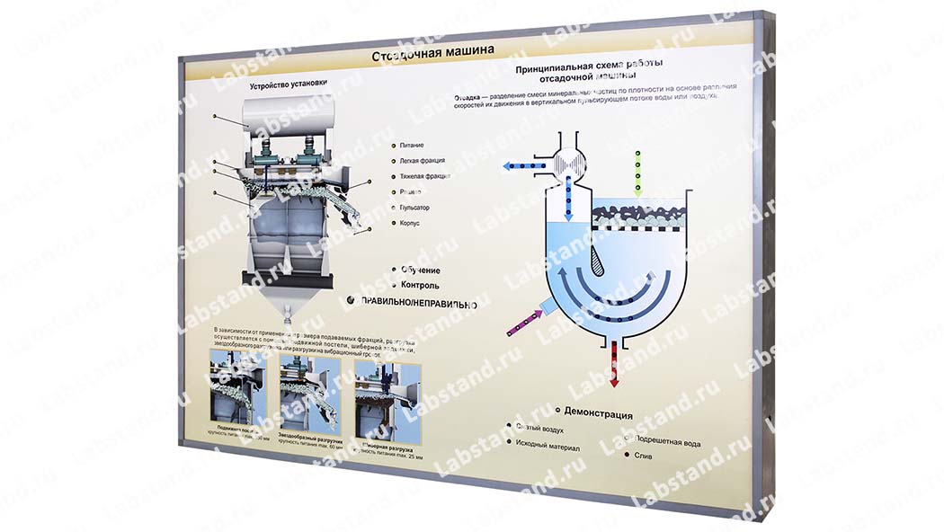 Назначение: Светодинамический стенд-планшет «Отсадочная машина» предназначен для освоения устройства и принципа работы подобных установок в технологических схемах обогащения угля в профильных учебных заведениях.