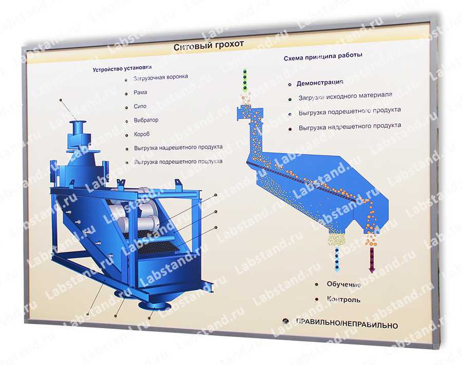 Состав: Стенд-планшет «Ситовый грохот», магнитная указка, блок питания, паспорт.