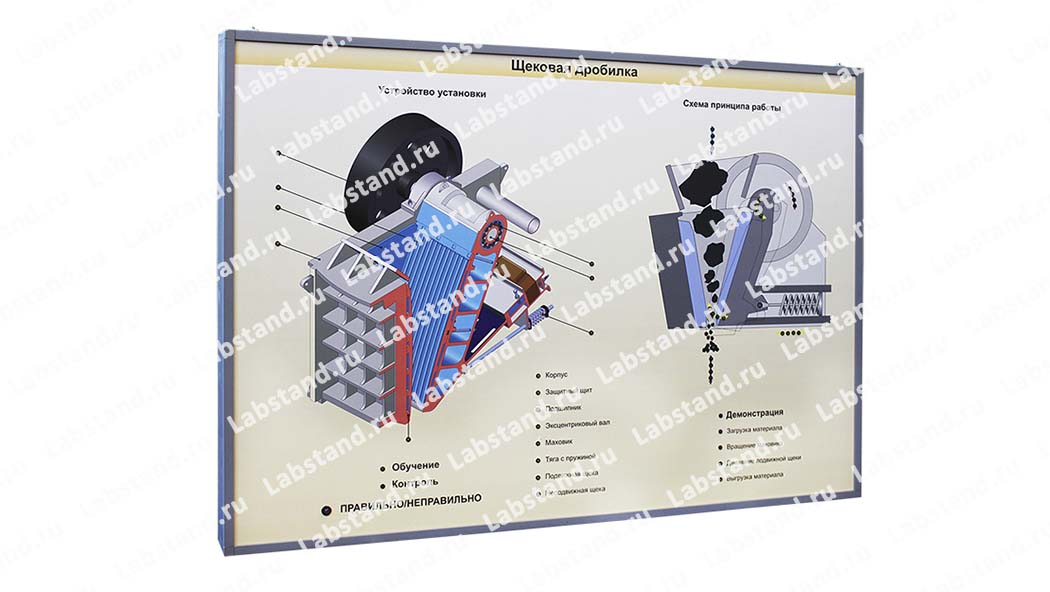Состав: Стенд-планшет «Щековая дробилка», магнитная указка, блок питания, паспорт.