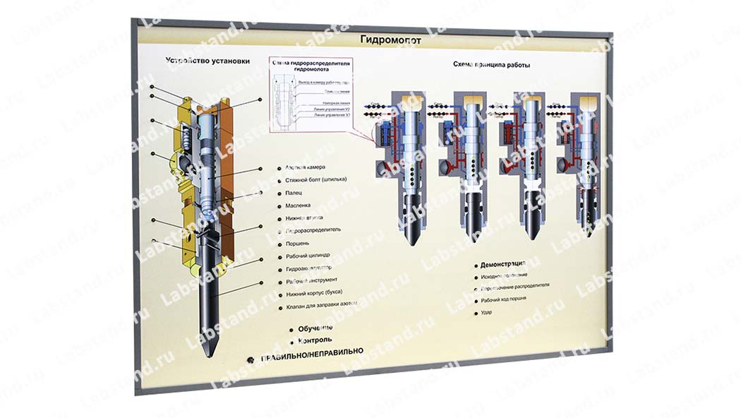 Описание. Стенд-планшет представляет собой жёсткую лицевую панель из МДФ толщиной 8 мм, в пластиковом каркасе толщиной 90 мм. На лицевую панель наклеена полимерная подложка с цветным изображением гидромолота, отражающим его принцип работы и устройство. Внутри каркаса расположен контроллер управления логикой стенда. С целью наглядной иллюстрации принципа работы и устройства установки на лицевой панели установлены динамическая светодиодная подсветка и магнитные сенсоры для реализации режимов «демонстрация», «обучение» и «контроль». В режиме «демонстрация» осуществляется светодинамическая демонстрация принципа работы установки. В режиме «обучение» при выделении одного из элементов установки загорается светодиод напротив соответствующего наименования элемента. В режиме «контроль» учащийся должен сам сопоставить наименование элемента с его изображением на лицевой панели.