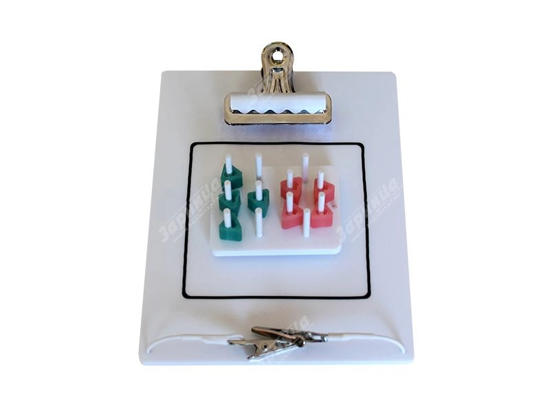 Упражнение представляет собой основание с поперечными штырьками, на которые натянуты 2 резиновые нити. С помощью клипатора эти нити соединяются между собой, а затем иссекаются в другом месте – посередине между наложенными клипсами. Таким образом получается единое кольцо.