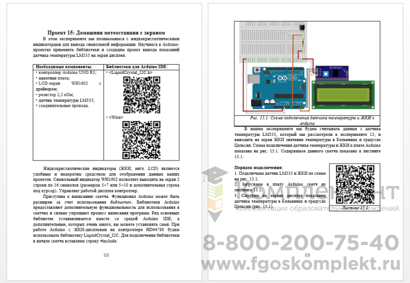 Набор рассчитан на десять учебных мест и содержит весь необходимый набор компонентов для успешного старта. Учебные материалы представлены в виде методического пособия, с которым могут работать как учителя, так и сами ученики. Советы по настройке программного обеспечения, подробная информация об электронных компонентах, цветные схемы, пояснения и тексты скетчей позволят работать с набором даже начинающим пользователям. Дополнительные усложненные задания не дадут скучать уверенным пользователям и откроют пространство для творчества.