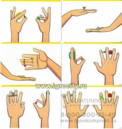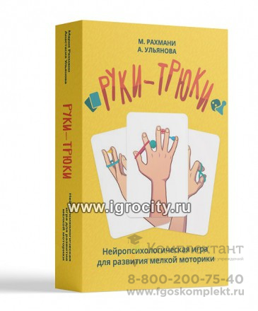 Как играть «Руки-трюки» — это настольная игра для развития мелкой моторики. На карточках нарисованы руки, удерживающие между пальцами мелкие предметы (жетоны, фишки, кубики, резиночки), рядом с каждым игроком лежат те же предметы, которые изображены на карточках. Задача игрока — быстрее соперника воспроизвести положения рук, удерживая предметы так, как изображено на карточках. Что в комплекте 80 карточек с изображением рук, держащих различные игровые предметы (20 карт для правой руки, 20 — для левой, 40 — для обеих рук); 8 игровых предметов: два кубика, два жетона, две резинки, две фишки; инструкция. Игра развивает мелкую моторику — необходимо точно воспроизводить изображенные на карточках положения рук; межполушарные связи и двуручную координацию — нужно выполнять движения то одной, то другой рукой, то обеими руками сразу; произвольный контроль и планирование — игроку требуется удерживать внимание и на карточке, и на своих руках, нужно определить порядок действий, в котором брать предметы будет наиболее удобно, и при этом следить за тем, чтобы они не выскользнули из рук; пространственные представления — нужно определить, какая рука изображена на карточке, какие предметы и как именно нужно удержать; способность переключаться — карточки для левой, правой и обеих рук перемешиваются в колоде и нужно быстро определять, какой именно рукой производить манипуляции; к тому же количество предметов на карточках разное (на одних — один-два предмета, на других — все четыре); память — в описанных ниже модификациях игры часто требуется запомнить положения рук и предметов и воспроизвести их по памяти. Кроме того, в этой игре, как и в любом другом соревновании, тренируется умение конструктивно обходиться с успехом или неудачей, что в свою очередь тесно связано с мотивацией к обучению. Составляющие любой игры — азарт и предвкушение успеха помогают справляться с неудачами (исправлять ошибки, продумывать новые стратегии) и усиливают мотивацию. Для обучения это очень важно. Сколько игроков может играть в игру "Руки-трюки" Игровой комплект рассчитан на двух игроков, не считая ведущего. На одного игрока приходятся одна резиночка, один кубик, один жетон и одна фишка. Предметы подобраны таким образом, что в случае их утери или если нужно увеличить количество играющих, предметы можно было бы легко заменить или дополнить. Кубик и фишка берутся из любой настольной игры, в качестве жетона можно использовать монетку или плоскую пуговицу, резинка тоже подойдет любая, но лучше, если это будет резинка для волос небольшого размер