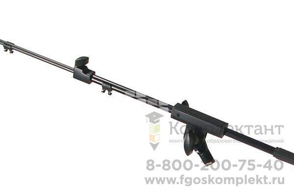 Стойка опирается на три длинные складывающиеся ножки, оснащенные специальными противоскользящими наконечниками. Конструкция данной модели выполнена по принципу «журавль», когда на основной оси, которая присоединяется к базе, закреплена вторая, длиной 76 см. Стойка оснащена удобным механизмом регулировки высоты. Комбинация двух стержней дает общую длину стойки от 52 см до 77 см. Стойка выполнена из прочной стали, представлена в черном цвете.