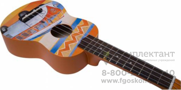 Отличительной чертой этой укулеле является ее дизайн - яркий автобус, ставший символом целой эпохи, так называемой "хиппи-мобиль". Стильный дизайн, наполненный духом свободы, и приятное звучание маленькой гавайской гитары не оставят равнодушными никого.