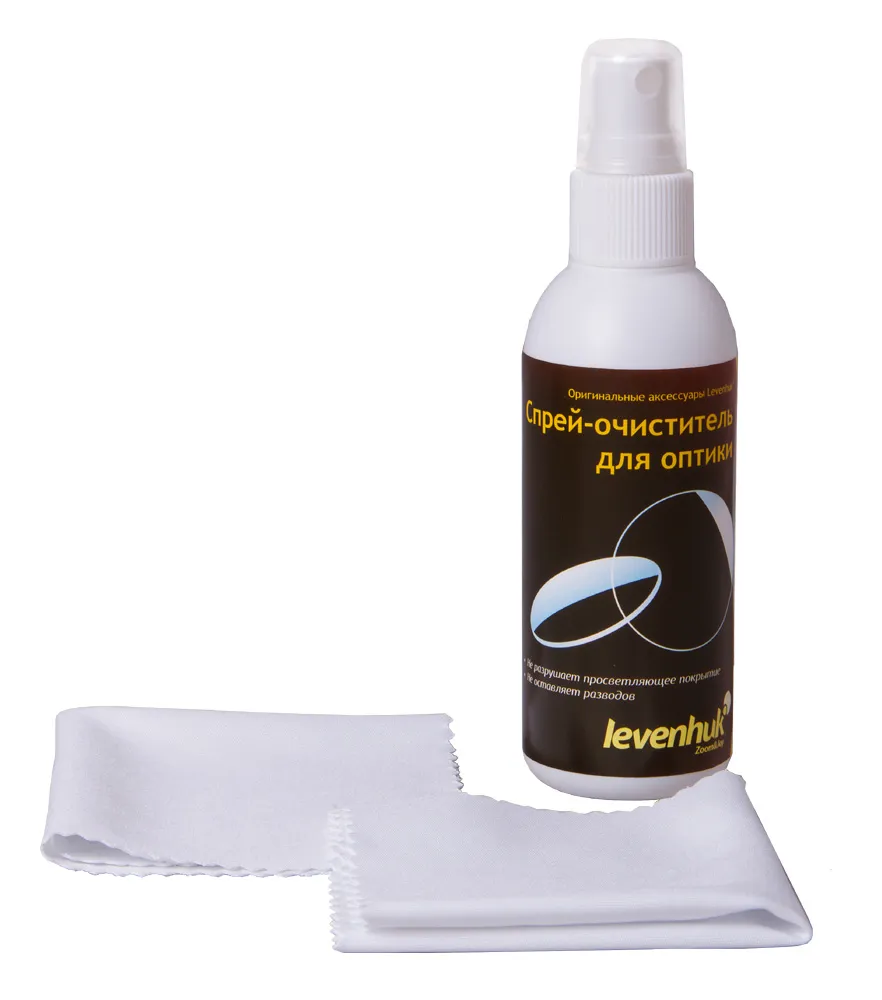 Компания Levenhuk представляет серию оригинальных аксессуаров для оптики. Этот набор включает спрей для чистки оптики 95 мл и 2 салфетки для очистки оптики из полиэстерового микроволокна. Состав спрея: вода очищенная, четвертичная соль аммония, консервант.