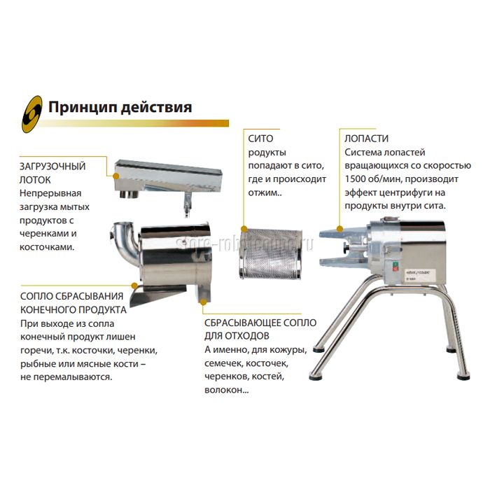 Бункер для загрузки продуктов не требует заранее нарезать продукты перед обработкой или удалять косточки, что в разы поднимает уровень производительности. Благодаря специальной воронке косточки, семена и стебельки не перетираются вместе с продуктами и готовое блюдо не будет горчить. Отходы (косточки, кожура, семена, большие волокна особых продуктов) выходят через специальное отверстие для выхода жмыха. Эргономика аппарата позволяет использовать емкости для готовой продукции больших размеров.