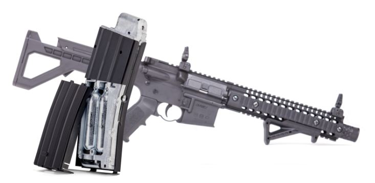 Отличительными особенностями винтовки являются подвижный реалистичный затвор, активная крышка окна выброса и кнопка досыла патрона. Помимо этого модель обладает поистине впечатляющей скорострельностью в автоматическом режиме стрельбы - 1400 выстрелов в минуту. В качестве боеприпасов используются стальные шарики 4.5 мм, а магазин вмещает 25 шариков. За совершение выстрела отвечают 2 баллона со сжатым газом СО2, оба они помещаются в магазине.