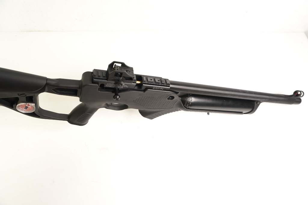 Здесь реализована уникальная система для предотвращения потерь воздуха при ударе оружия об землю или другую твердую поверхность. Установлен манометр, контролирующий давление в резервуаре. Для стрельбы используются пули 5,5 мм, клип-барабан вмещает 12 снарядов.