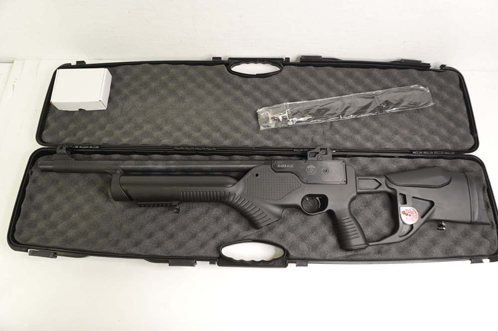 Для ствола и ответственных внутренних элементов Hatsan Barrage использовалась сталь, приклад и ложе модели полимерные. Рукоять пистолетного типа и цевье имеют насечки для комфорта хвата. Приклад винтовки тактический, щека регулируется под анатомические особенности каждого стрелка. Резиновый затыльник на прикладе амортизирует отдачу.