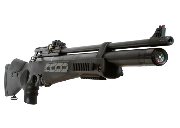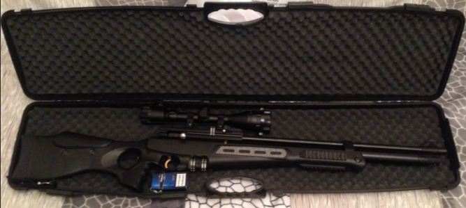 Очень богатая комплектация: пластиковый кейс, тактический фонарь, оптический прицел Optima 3-12x44 AOE с отстройкой от параллакса и подсветкой сетки, 3 магазина, ремень, сошки, набор резиновых прокладок, заправочный штуцер, стравливатель воздуха из резервуара