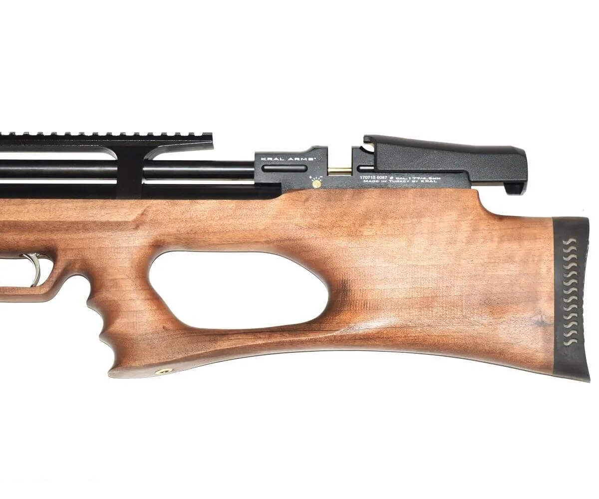 Все детали корпуса, такие как ложе, приклад и пистолетная рукоять изготовлены из качественного дерева. Это придает винтовке очень красивый и действительно элитный вид. Кроме того, дерево требует определенного ухода и поэтому Kral Puncher Breaker 3W подойдет именно серьезно увлекающимся оружием владельцам.