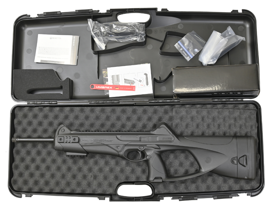 Umarex Beretta Cx4 Storm оборудована прицельным приспособлением с фибергласовыми нитями и специальным креплением для размещения оптики. Кроме того, имеется дополнительная подствольная планка Вивера (22-миллиметровая) для размещения различного рода прицелов (коллиматорного, оптического) или тактического фонаря. Большим достоинством винтовки Umarex Beretta Cx4 Storm является емкость магазина, который рассчитан на 30 пуль типа Диаболо, что позволяет не перезаряжать ее после каждого выстрела. Модель оборудована неавтоматическим предохранителем, а также регулируемым спуском. Винтовка поставляется в качественном пластиковом кейсе (+ прицел 4x32, модератор)