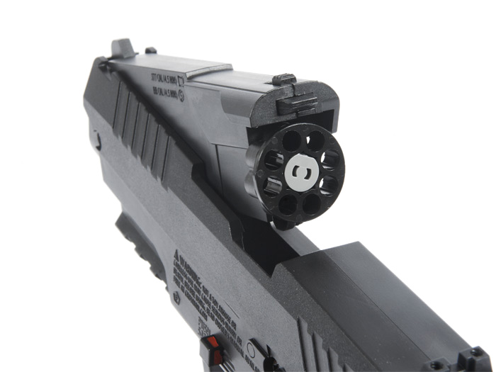 Под стволом пистолета имеются тактические салазки (планка Пикатинни) для установки лазерного целеуказателя или тактического фонаря.