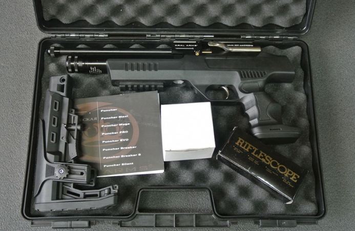 Пневматический пистолет Kral Puncher NP-01 укомплектован мощным клапаном, двумя барабанами, прикладом, коллиматорным прицелом, заправочным штуцером, уплотнительными прокладками, шестигранным ключом и крепёжным болтом. Всё это эргономично помещается в пластиковый кейс для хранения и транспортировки.