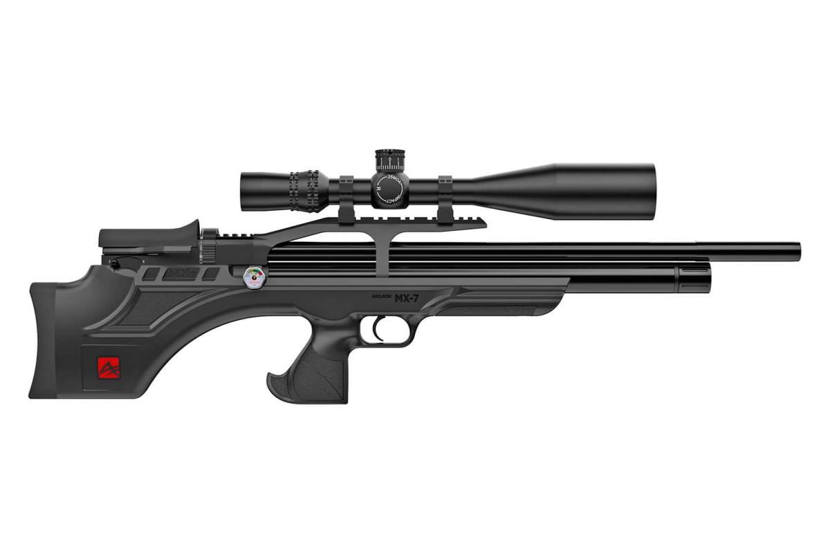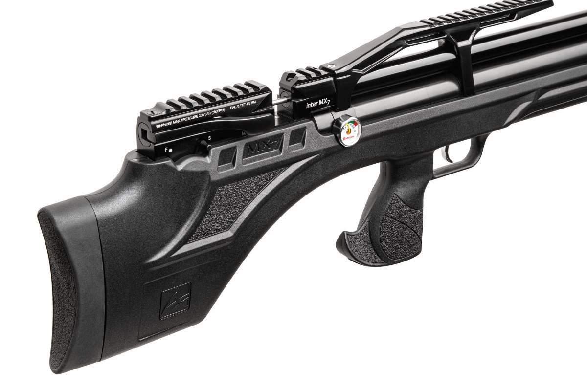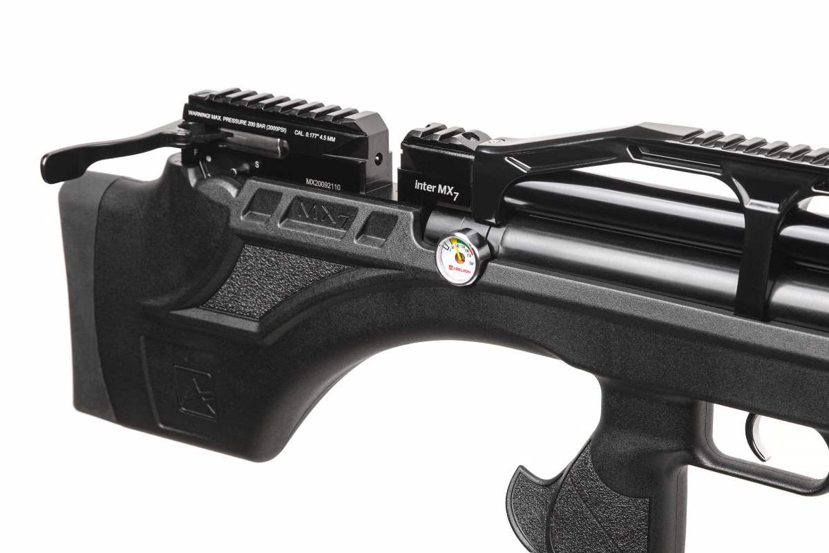 MX 7 - новая PCP винтовка Aselkon с боковым взводом в компоновке булл-пап. Оснащена комфортным эргономичным ложе, выполненным из качественного полимера черного цвета. Для установки оптических аксессуаров оружие оснащено планкой пикаттини 22 мм. на MX7 Black установлен резервуар, объемкоторогом 320 кубических сантиметров. Для ведения стрельбы необходима предварительная накачка. С одной такой накачки возможно выполнить до 80 выстрелов. Для мониторинга давления установлен манометр.