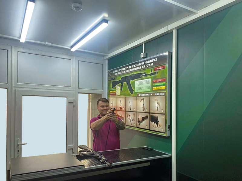 Позволяет проводить огневую подготовку при отсутствии стационарного учебного тира или полигона, в любой местности и при любых погодных условиях. Мобильный тир “Патриот” оснащен всем необходимым оборудованием для проведения практических занятий. Он уже включает в себя массогабаритные макеты оружия, экраны, стойку и кондиционер для работы в комфортных условиях.
