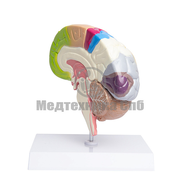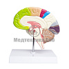 На модели сагиттального разреза головного мозга представлена локализация функций в коре полушарий большого мозга. Каждая зона окрашена в отдельный цвет.