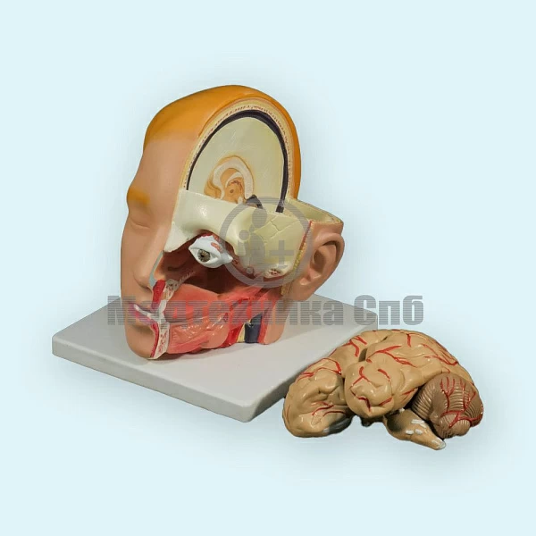 Съёмный модуль глазного яблока с имитацией глазного нерва позволяет изучать анатомическое строение органов зрения. Затылок и основание черепа открыты.